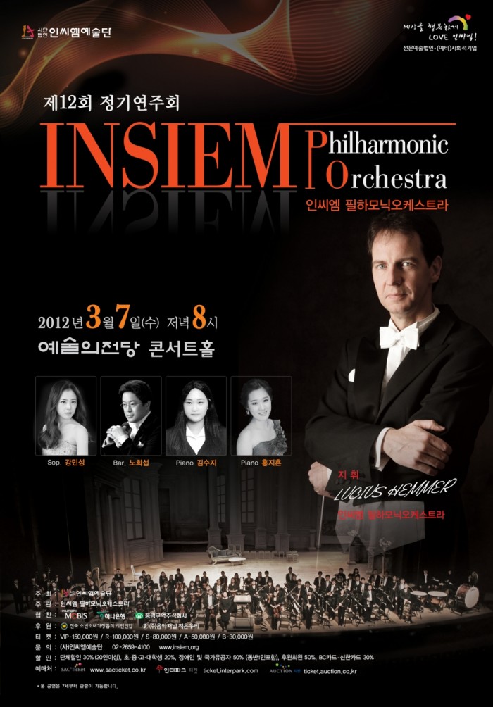 인씨엠필하모닉오케스트라(단장 이순민) 오는 3월 7일 뉴렘베르크의 예술감독 루시우스 헤머의 객원지휘로 전국 소년소녀가장과 함께하는 제 12회 정기연주회를 갖는다.
