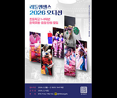 공지 리틀엔젤스, 2026 오디션 개최… 초등 1~6학년 신입단원 모집 (최고관리자/2026-02-05 15:58:57) 2월 2일~18일 원서 접수… 21일 오디션 실시한국무용·합창 분야 공연 예술인재 발굴2026년 1월 26일 -- 대한민국을 대표하는 전통공연예술 문화사절단인 리틀엔젤스예술단이 미…) 02-05 1345
