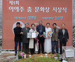 공지 故 이애주 춤 정신 잇는 ‘이애주 춤 문화상’ 제1회 시상식 성료 (최고관리자/2025-05-30 15:11:31) 전통계승 부문 김연정, 시대창작 부문 장순향 씨 수상 영예 안아이애주의 춤 철학과 실천 정신 기리며 한국 춤 발전 기여 약속2025년 5월 12일 -- 한국 문화예술계에 큰 발자취…) 05-30 2285